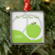 A Christmas ornament for teachers featuring an illustration of a green apple at right. Green design across bottom. Grey swirl background. Personalize with your name in green at top and the year in white at bottom left.