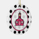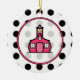 A teacher Christmas ornament featuring a background of black polka dots over white on front. Pink Schoolhouse logo inside pink frame.