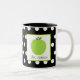 A teacher mug featuring an illustration of a green apple inside a white square with green trim. Background is black with white polka dots and green trim.