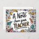 Brighten your students' day with this colourful and fun postcard! Perfect for elementary school, this 'A Note from Your Teacher' postcard is ideal for back to school greetings, or a positive note home. Teachers can use this educational and engaging design to welcome students in a memorable way. Featuring playful school supplies and an apple illustration, it’s perfect for all ages. Add a personal message on the back to make each student feel special. Great way for teachers to develop relationships or just to share student progress.