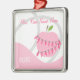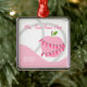 A Christmas ornament for teachers featuring an illustration of a pink apple at right. Apple is wrapped in pink Christmas lights. Pink design across bottom. Grey swirl background. Personalize with your name in pink at top and the year in white at bottom left.