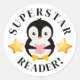 A cute penguin reading 'Superstar Reader' sticker, ideal for rewarding your child or student for their reading performance. Kids will adore this cute hand drawn penguin who is holding a book. These stickers are a fun and super cute way to reward your hard working kids!