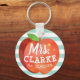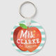 A fun and lighthearted seafoam green striped keychain featuring a stylized apple illustration. Inside of this apple is your favourite teacher's name in a playful style font.