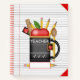 Teacher's Apple and a Mug on a notebook. The cover has an image of an apple in a mug, classic yellow pencils, rulers and a black chalkboard mug on old-school ruled pages. Choose your own custom title or add a name as optional choice. And decide on the look of the interior pages, and the colour of the spiral.