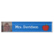 Stylish school teacher's desk nameplate done in blue, with graphics of a red apple, on the far right side. Add your own photo, on the left side of the nameplate and personalize the white text with your name. Makes a great back to school gift idea.