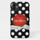 Pretty iPhone 5 case with graphics of a small flower pattern on juicy red, against a black and white polka dot background. Graphics of a white ribbon and bow runs across the bottom of the apple. Personalize the white text. Great for yourself or as a gift idea for your favourite teacher.