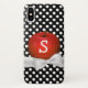 Pretty iPhone X case with graphics of a small flower pattern on juicy red, against a black and white polka dot background. Graphics of a white ribbon and bow runs across the bottom of the apple. Personalize the white one letter monogram. Great for yourself or as a gift idea for your favourite teacher.