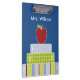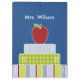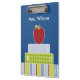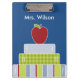 Teacher's clipboard, with colourful graphics of a stack of books and an apple, on top, against a blue background. Personalize the white text for a great teacher's gift idea.