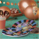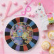 Set of eight 9” paper plates with an image of colourful teacups and teapots framed with a black, purple, blue and orange sunburst. See matching plastic and paper coasters. See the entire Wonderland Plate collection in the FOOD/BEV | Dishes section.