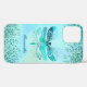 Stylish iPhone case, with graphic artwork of a teal abstract dragonfly and teal faux glitter against a light teal watercolor background. Personalize the teal coloured text for a very special gift idea for her.