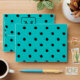 A polka dot pattern in teal and black with a monogram initial letter that can be personalized.