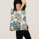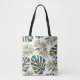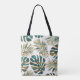 Teal and gold patterned tropical leaves brush paint strokes tote bag. It showcases patterned tropical leaves with brush strokes in teal blue and gold and confetti. You can customize it and add your images or graphics.