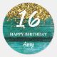 Add a stylish finishing touch to your Sweet 16 celebration with this round sticker featuring a rustic teal wood background, sparkling gold glitter look, and custom name. Perfect for party favours, gift bags, or envelopes.
