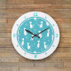A teal and white pattern of sitting silhouette cats is the background for this cute novelty clock. A white outer ring holds matching teal numbers at the 12, 3, 6, and 9 positions, with little cat paws at the remaining positions. *Thanks to ThingsByLary for the pattern in this design.