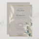 This engagement party invitation features the elegant duo of feathery pampas grass and smokey teal anthurium leaves that are edges in gold - combine this with the rich mushroom taupe background and you have an elegant and memorable wedding theme.