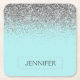 Teal Aqua Blue Silver Glitter Girly Monogram Name Square Paper Coaster