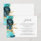 The left-hand edge of this elegant modern wedding details enclosure card features a teal blue and aqua floral arrangement trimmed with faux gold foil foliage. The text is in charcoal gray script and sans serif fonts on a white background. The reverse side features a matching floral design.