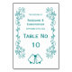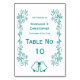 Teal coloured wedding table number bells design. You can customise this teal coloured wedding table number with your own wedding details. Should you require any help with customising then contact us through the link on this page. Bells scrollwork design personalised teal coloured wedding table number