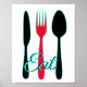 This poster is black, white, red and teal with the text, "Eat," with a graphic of fork, knife and spoon. Modern sleek look will add a pop of color to your kitchen.