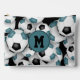 This soccer themed zipper pouch features a random pattern of varied size teal, black and white soccer balls turned every which way on a black background - customize with the soccer player's monogram - by katz_d_zynes