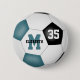 This personalized soccer button for girls (or boys) features the realistic image of a soccer ball that has teal, black and white panels - customize the player's name, monogram and jersey number - by katz_d_zynes