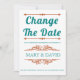 Vintage elements and teal blue and rust typography wedding Change the Date postponement announcement. This elegant wedding design displays the text "Change the Date" in bold teal blue typography and vintage elements that form frames for the text. The back features the photo of the couple.