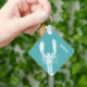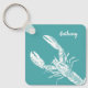 Create a personalized accessory with a nautical style. This keychain has an illustration of a lobster in white against a teal blue background and is ready to be personalized with a name or other text in white script or cursive writing. The background colour on this keychain can be changed to a different colour. Select the customize further option to modify the background. Please note: you will need to change the colour on both the back and front of this keychain.