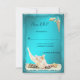 Beautiful seashells on white beach sand stand out against the turquoise teal blue aqua background and wave like frame. Add your own text to customize this beach seashell wedding RSVP card.