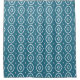 A bohemian teal blue shower curtain with a boho geometric ornament pattern.