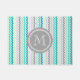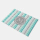 Custom monogrammed doormat with retro chevron zigzags stripes pattern in turquoise aqua teal blue and grey and modern dark grey and white monogram.
