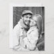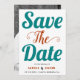Teal blue and rust typography and photo on the back Save the Date announcement.