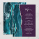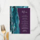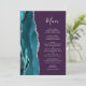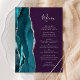 The left-hand edge of this elegant modern wedding menu features a teal blue watercolor agate border trimmed with faux silver glitter. The customizable text combines silver grey handwriting script and copperplate fonts on a purple background. The reverse side features a matching teal and silver agate design.