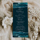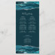 This elegant, modern wedding program features teal blue watercolor agate top and bottom borders trimmed with silver faux glitter. The text appears in elegant silver grey handwriting and copperplate fonts on a deep teal background.