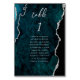 This elegant modern wedding table number card features a teal blue watercolor agate background trimmed with faux silver glitter. The word "table" appears in silver gray handwriting script. Add the names of your guests who are assigned to each table.