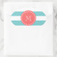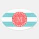 Teal Blue White Stripes Pattern, Coral Monogram Oval Sticker