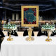 A teal blue jewel tone wedding Favours: Please Take One print featuring a symphony of deep bordeaux raspberry red peonies adorned with gold spray and shimmering gold outlines gather around a deep teal blue watercolor wash background with your names in gold rustic script and a small uppercase non serif font announcing the details.