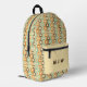 This backpack has a teal blue, chocolate brown and orange colour scheme. A simple pattern of rectangles and lines that's got a groovy seventies sort of feel. This pattern has a cream coloured background with the geometric design in teal blue or aqua blue, orange and chocolate brown. The geometric graphics have a scratchy distressed look for a worn vintage feel. The vintage-inspired colours are perfect for adding a bit of a 1970s feel to your day. The front pocket is ready to be personalized with your initials with dark brown letters against a cream coloured background.