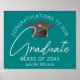 This modern teal custom graduation party poster features your high school or college graduate for the class of 2025. Customize with your graduating year under the chic handwritten script and grey grad cap for trendy personalized graduation party decor.