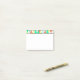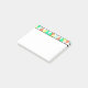 Rectangular post-it note pad printed on upper border with a hand-drawn zigzagging pattern of white, teal, light aqua teal blue, butter yellow, and salmon coral orange triangles, tied together by black ink pen drawn lines.