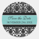 Save the Date envelope seals for wedding, in elegant turquoise blue, black and white classic floral damask pattern, the perfect addition to your save the date card envelopes, available in matching cards and magnets.