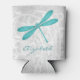 Keep your beverages cold in the summertime with a Teal Dragonfly Personalized Can Cooler. Cooler design features a colourful dragonfly, a soft white leafy vine against a light grey grunge damask background with an area to personalize with your name. Additional gift items available with this design as well as a variety of colours.