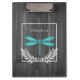 Jot down notes and reminders on a secure surface with a Teal Dragonfly Rustic Personalized Clipboard. Clipboard design features a vibrant dragonfly adorned with delicate foliage against a dark grey rustic wooden background. Additional gift items available with this design as well as a variety of colours.