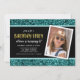 Teal Glitter Photo Birthday Party Invitation features the words "Birthday Party" in a fun sans serif font in faux gold foil with a glitter top and bottom and a black centre background. Invitation has a teal, black and faux gold foil stripes pattern back side.