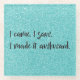 Protect your tabletops or furniture surfaces with a Teal Glitter I Made It Awkward Glass Coaster. Coaster design features the text "I came. I saw. I made it awkward." in a handwritten font against a teal glitter background. Additional gifts available with this design as well as a variety of colours.