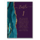 The left-hand edge of this elegant modern wedding table number card features a teal watercolor agate border trimmed with faux gold glitter. The word "table" appears in gold-coloured handwriting script on a purple background. Add the names of your guests who are assigned to each table.