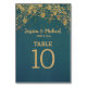 Elegant teal with glittering gold string lights and bokeh wedding reception table number. Contact us for help with customization or matching products.