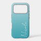 A custom personalized iPhone case in a modern soft teal blue gradient design. The trendy handwriting script font adds a unique touch when adding your name.