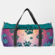 This colourful pattern duffel bag showcases a captivating teal and blue gradient background adorned with multiple shades of coloured paw prints. It's a stylish and versatile travel gear piece, ideal for any pet lover.