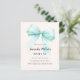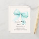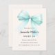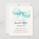 A soft beige, cream coloured background, decorated with a large teal, light green coloured bow. Personalize and add a name and party details.
