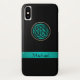 Teal Green Celtic Knot iPhone X Case. A black case for your iPhone X with a green sash Celtic knot. Fill in your name at the prompt to personalize and customize any way you like. Celtic knots are an ancient Celtic traditional art form usually characterized by having no beginning and no end. They symbolize eternal love and the never-ending cycle of life. They have been found to be a favourite symbol in many varied cultures and civilizations, and with many practitioners of magic or mysticism today. This four-sided shield knot represents protection. A perfect symbol on a case custom made to protect your most precious device.